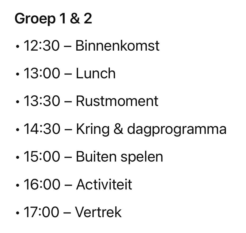 Wij werken met vaste tijden, duidelijke afspraken en heldere communicatie. Ouders worden geïnformeerd over het dagprogramma, activiteiten en bijzonderheden. Zo zorgen we samen voor continuïteit tussen school, opvang en thuis.