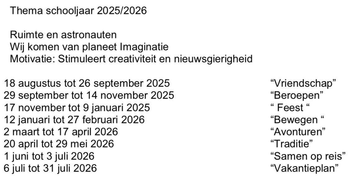 Wij werken het hele schooljaar met thema's. Deze zijn zichtbaar in de activiteiten, materialen en groepsinrichting.